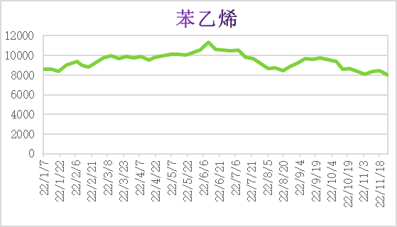 苯乙烯:國內苯乙烯市場價格下跌較多,北方市場價格低位,京津冀市場以及個別企業價格暫穩運行,在下跌的情況下,苯乙烯下游采購積極性不高,多以低掛為主,意向買到8000元/噸左右的價格,持貨商積極銷售,下游逢低采購情緒增加,短期內苯乙烯市場繼續下跌為主。